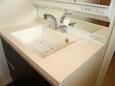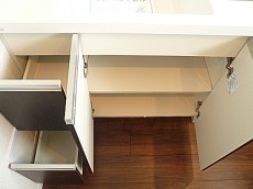 スクエア型の洗面ボウルはスタイリッシュ~洗面ボウル下部の収納は引き出しが2段付いていますので、かさばるドライヤーなども仕舞えそうです。