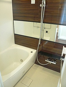 TOTO製追炊き機能付きバスルームです。濃いブラウンのアクセントパネルが落ち着ける空間を演出してくれています。リラックスできる入浴タイムになりそう!シャワーの位置は上下に移動可能!洗いやすい位置でお使い下さい。