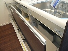 端から端まであるスライド式収納、奥までしっかりと仕舞え出し入れもしやすいですね。
