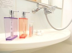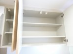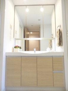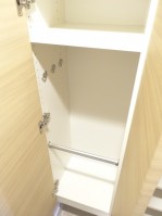 大型の洗面化粧台は鏡の裏が一面収納になっており、ゴチャゴチャ散らかりがちな水まわりのハブラシや小物類もスッキリ片付けられます。2人並んで身支度ができそうなのも忙しい朝の時間帯はうれしいですね。すぐ右となりには細い&縦長の収納も。シャンプーやボディソープのストックを入れておいたり、タオルをしまったりと重宝しそう。