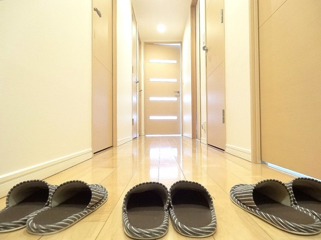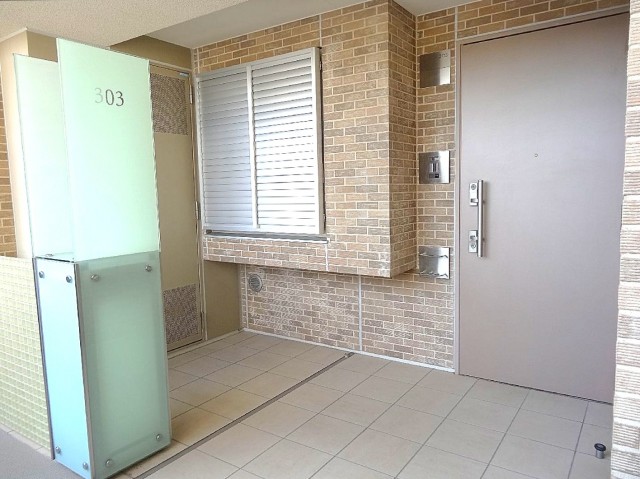 お部屋は3階。廊下は外廊下なのですが玄関前の部分だけ、ガラスのついたて(?)がついているので陽ざしが感じられつつも雨や風の影響を受けるのは少なくて済みそう。これはうれしいです!
