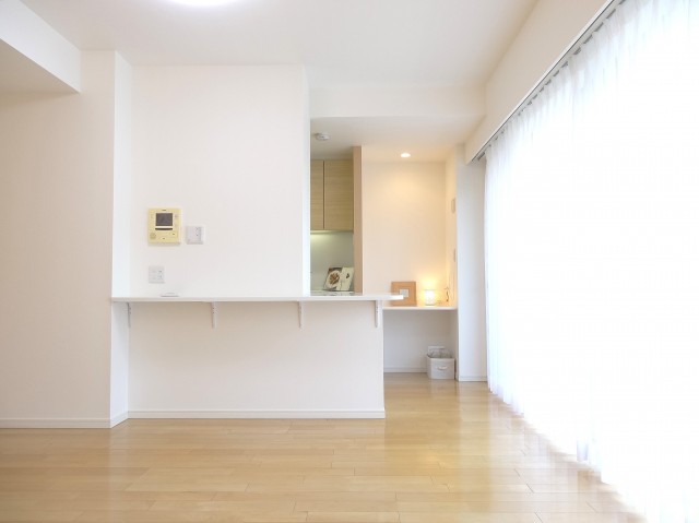 約15.8畳のリビングダイニングキッチン。ツルリとしたナチュラルな色合いのフローリングに白いクロスの明るい空間は家族の集いの場にピッタリ。