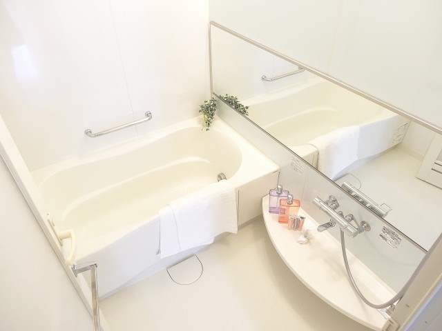 白いバスタブにうすーいブルーの壁パネルのさわやかな印象のバスルーム。