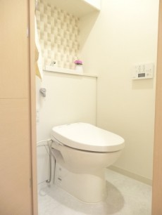 背後には手洗い場と吊戸棚付き。 トイレ内に必要なものは全て揃っているのではないでしょうか。幾何学模様のようなクロスが上品な雰囲気を醸し出しています。