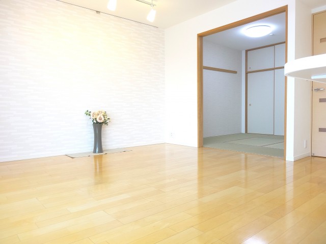 和室の扉を開けて、リビングとつなげると奥行のある空間になりました。生活シーンに合わせて独立して使ったり、つなげて使ったりとフレキシブルにご利用いただけます。