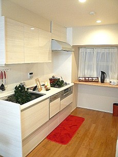 システムキッチンです。コンロ側には窓があり、風通し良く自然換気もできます。