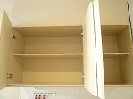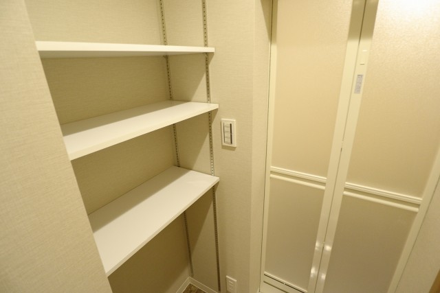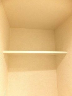 洗濯機置き場背面にある収納棚です。可動棚なので、整理整頓しやすいように調節できそうです。浴室が近いのでタオルを置いておけると便利ですね、