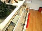 収納はスライド式のキャビネット。奥の方まで出し入れがしやすく、ぎっしり詰めても一目で中の確認が出来る優れものです。大きさや深さがいろいろあってカトラリー用の引き出しもありましたよ。背後は冷蔵庫のスペース(脚立などが置かれている所)と・・・洗濯機スペース!洗濯機といえば洗面室のイメージですが最近はキッチンで見かけることも多くなりました。結構奥行きがあるので洗濯物を入れるバスケットなども置いておけそうです。