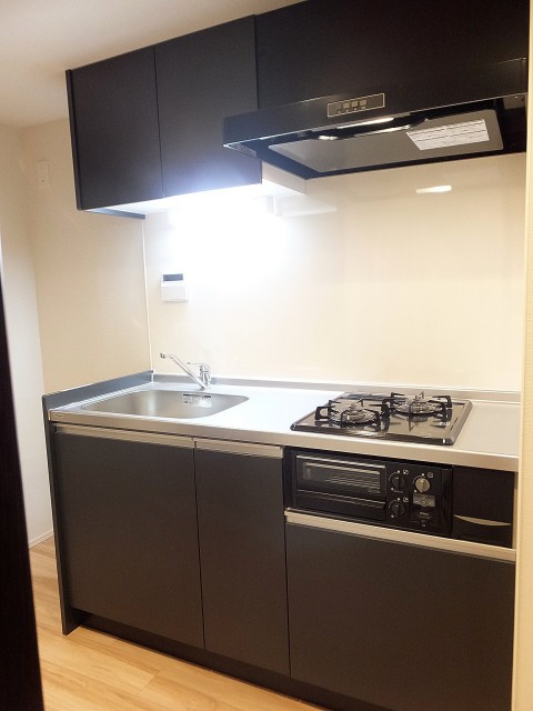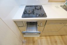 コンロは3口、グリル付。グリルってお掃除が面倒であまり使わない方も多いと思いますが、「グリラー」を使えばグリルの汚れを心配する必要はありません。蓋の付いた陶器皿のようなもので、グリルだけでなく電子レンジや直火でも使えるのでオススメですよ。水栓は 美味しいお水が気軽に使える浄水機能付き!