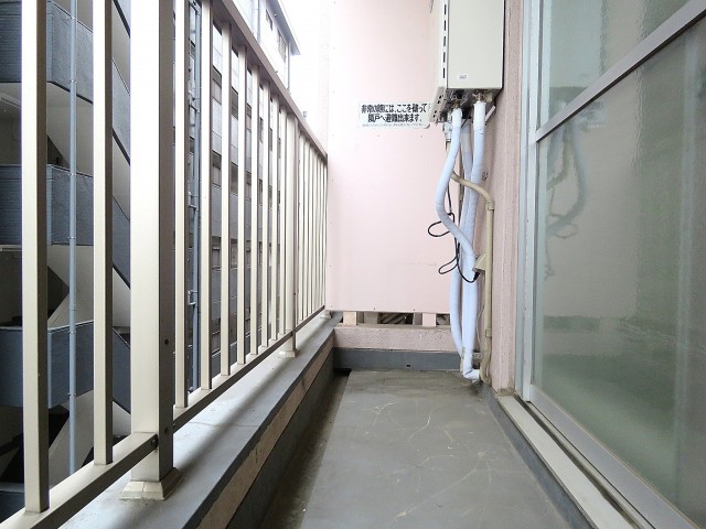 南東向きで広さは5㎡くらいでしょうか。奥行きはあまりありませんが二部屋分の幅のある細長いバルコニーです。手すりが足元まで柵になっているのでまずまずの解放感。