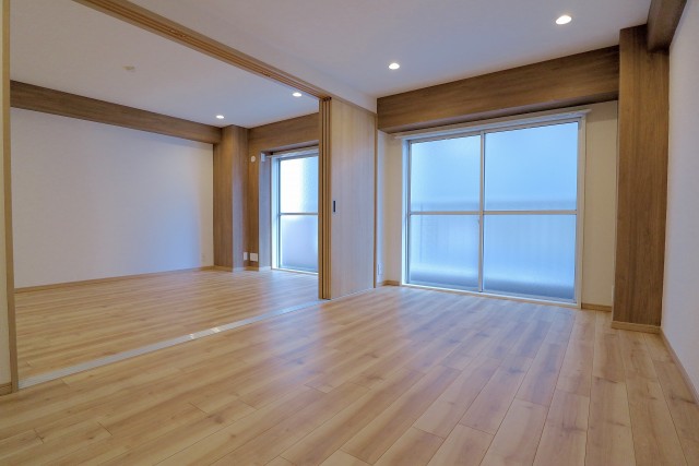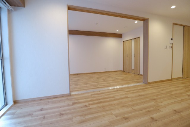 こちらは洋室との仕切り扉を全開にしてひとつながりのお部屋にした様子です。合わせれば約19帖!!!お一人暮らしならこんな感じでワンルーム使いもいいかもしれませんね。状況によってフレキシブルに使えるのは嬉しいものです。
