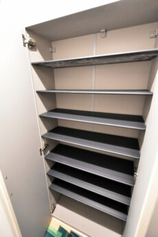 玄関収納です。両開きの扉は見やすく、棚は可動式なので高さのある靴でも仕舞いやすいですね。