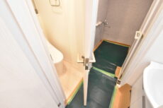洗面室には洗面化粧台の他に浴室とトイレがまとまっていて脱衣所も兼ねています。養生シートがこちらへ伸びていますが洗面は完成しているようですね。