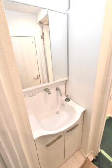 正面に洗面化粧台、並びに洗濯機置き場、右手にバスルームとなっています。