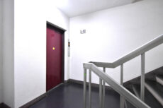 7階のボタンを押してエレベーターを降りると階段の踊り場に出ます。上がれば8階、下がれば7階。今回のお部屋は7階なので階段を降りて外廊下を進みます。