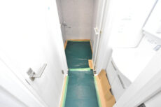 限られたスペースをなるべく有効に使えるよう、玄関から続くホールは超コンパクト。とはいってもこのドアがあるとないとでは大違いですからね。リフォーム工事のため養生シートが敷かれているので全体的な雰囲気はよく分かりませんが、壁天井は白を基調とした明るい雰囲気です。
