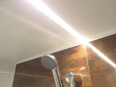 リビング入口の横にはガラス棚が設置されており、エコカラットとダウンライトで