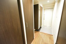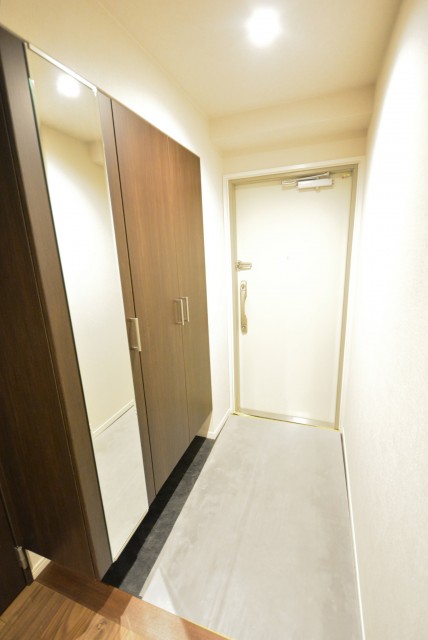 振り返って玄関の様子。扉の姿見、靴を履いた状態で全身見れるのが嬉しいですね。