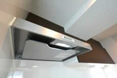 上部には換気扇と吊戸棚。出し入れしづらい吊戸棚は出番の少ない調理器具の定位置になりがちですが、収納グッズを上手く使って有効活用したいですものです。