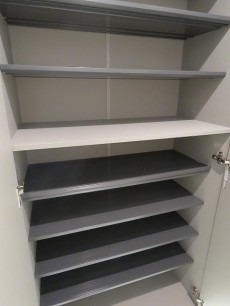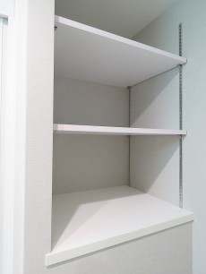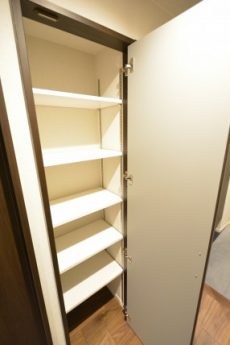 入口近くには収納棚。棚の高さが変えられるので、調整次第でいろいろな物を入れられそうです。下を大きく開けて掃除機とか。