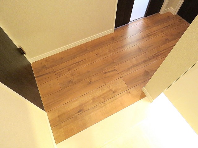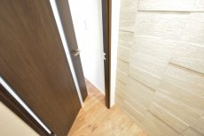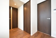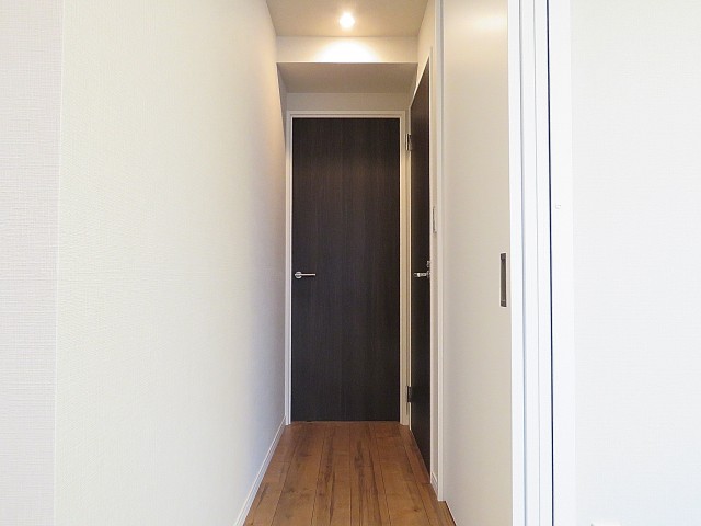幅の広い廊下はダークブラウンの建具で落ち着いた雰囲気。正面のアクセントウォールもいい感じです。