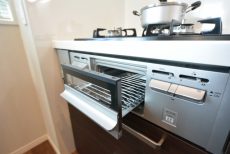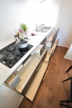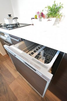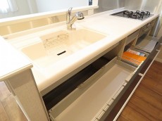 調理台の下は引き出しタイプの収納と食洗機になっています。一人暮らしだと食洗機のありがたみが分かりづらいんですが、ご家族が多いと食器の数も桁違い。一度使ったら止められません(笑)楽なだけでなく、高温で洗うので除菌効果もあるんですよ。