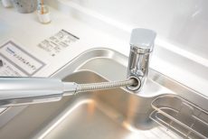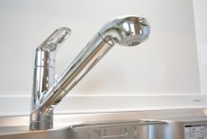 水栓は浄水機能付きシャワー水栓。ヘッドが伸びてシンクのお掃除などにも便利です。