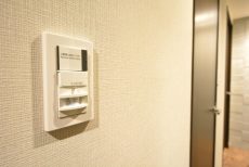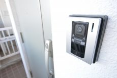 玄関に到着!ドア横にはカメラ付きインターホンが設置されていて、室内のテレビモニターで訪問者を確認する事が出来ます。『ハイ』と返事をする前にチェックをしましょう。