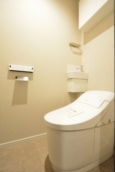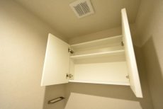 玄関から一番近い扉はトイレ。ウォシュレットとペーパーのストックやちょっとした掃除用具の収納に便利な吊り棚がついています。窓があるので自然換気もサッと済ませられます。
