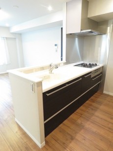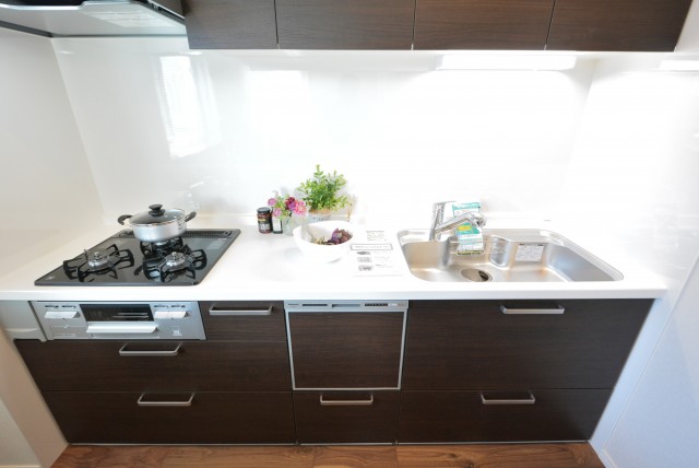 キッチンは浄水器能付き水栓、3口ガスコンロ、人造大理石トップとスペック◎!