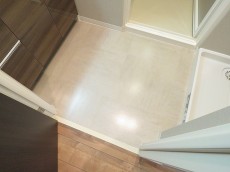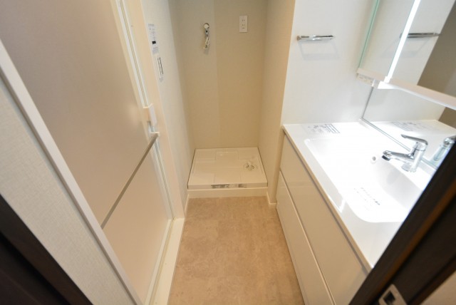 洗面室。脱衣スペースを囲むように洗面化粧台、洗濯機置場、バスルームがまとまっています。玄関横にあるトイレと位置が少し離れています。