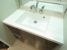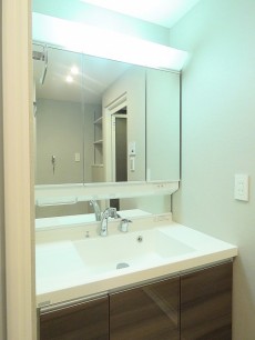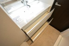 鏡の裏、引き出しと洗面化粧台は収納スペース豊富。