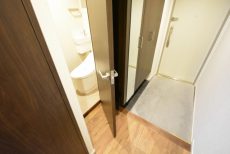 玄関をあがると廊下が横にのびており、トイレ、洋室、LDKの扉が廊下を囲むようにあります。順番に見ていきましょう。
