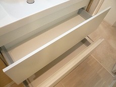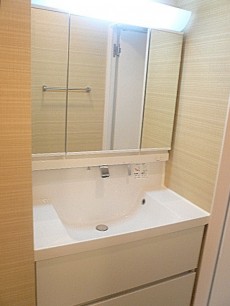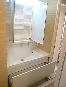 真っ白な洗面台です。スクエア型でスタイリッシュ。大きな三面鏡はとてもみやすく朝のヘアーセットも鏡をずらせば後ろのほうまでチェックもできそう!鏡の裏はもちろん収納、細かいアクセサリーやヘアーゴムなどもまとめられそうです。下の引き出し収納はみやすく整理整頓もしやすいですね。タオルなどもクルクルたためば収納バッチリ。