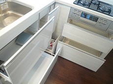 2.5帖のキッチンです。L字型のキッチンは調理スペースも充分にあり、コンロの前には大きな窓もあります。魚を焼いてもお肉を焼いても自然換気できお部屋ににおいが残らずすみそうです。収納もバッチリあり◎整理整頓しやすい引き出しタイプは大きなお鍋もスッポリ入りそうです。