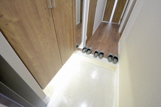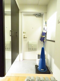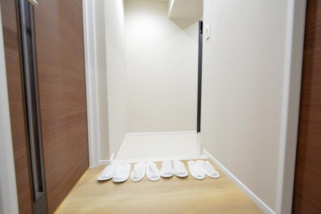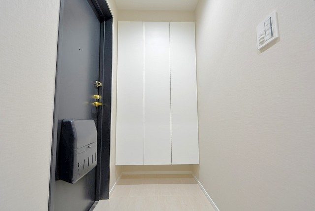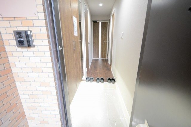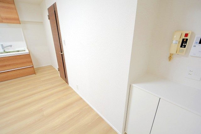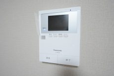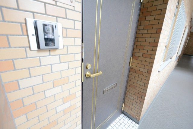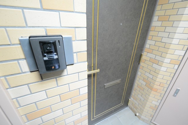 玄関の外にはカメラ付きのインターフォンが見えます。セールスや勧誘などはお部屋にいながらお断わりしましょう。