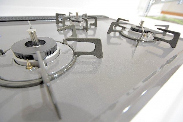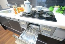 3口のグリル付きガスコンロが付いています。3口あればほとんどのお料理は問題なく作ることができますね。グリルもあれば怖いものなしです。