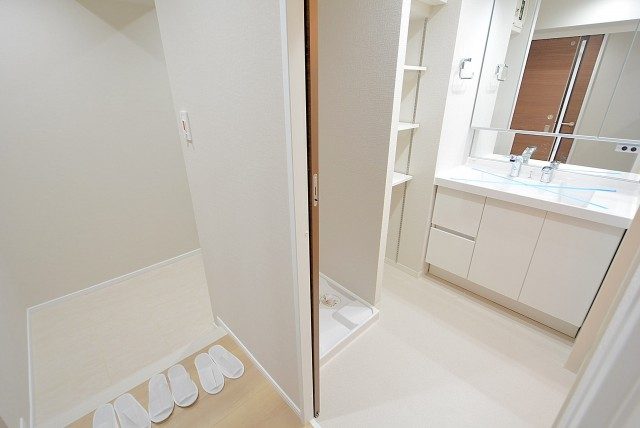 洗面化粧台、洗濯機置場、バスルームがこちらにまとまっています。