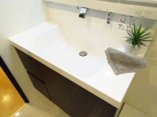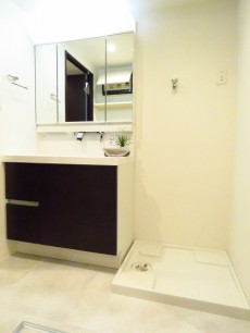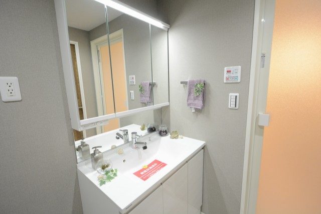 洗面化粧台と洗濯機置場はお隣同士。鏡の裏、引き出しなど小物の収納スペースも豊富です。