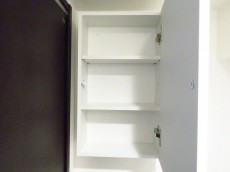 収納はミラーキャビネット、洗面ボウルの下と横に設置されている棚とがあります。