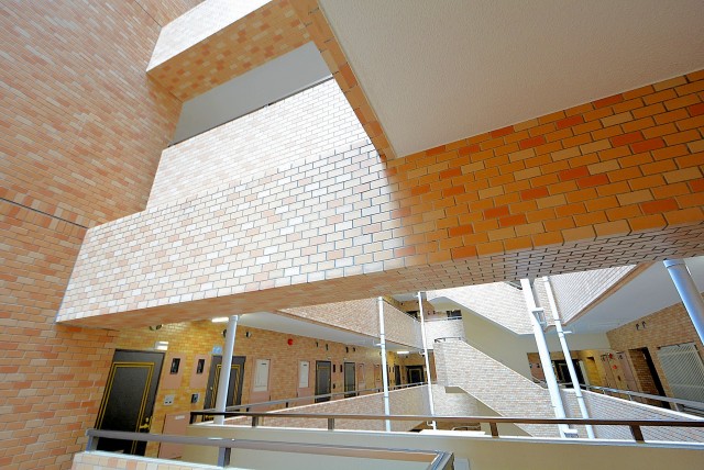 明治通り沿いに建つ大規模マンションです。外観はブラウンのタイル貼り。