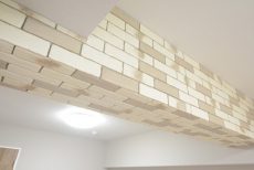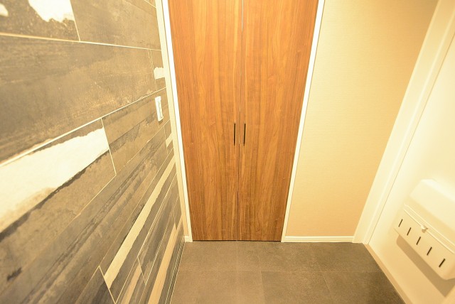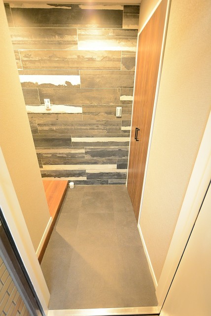 扉に鏡がついているのでお出かけ前の身だしなみチェックもサッと済ませられますよ♬壁面のブリックタイルもオシャレですね。