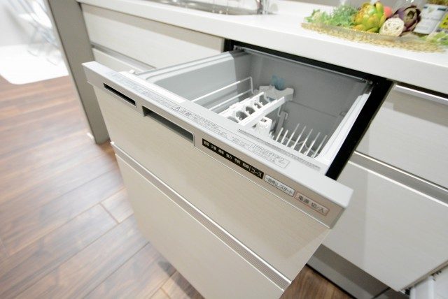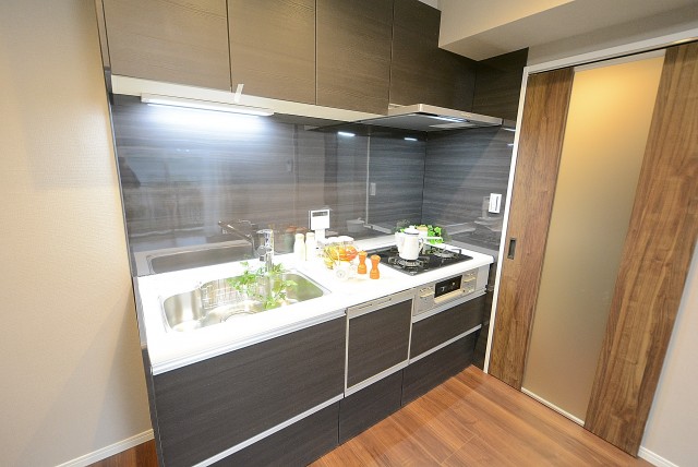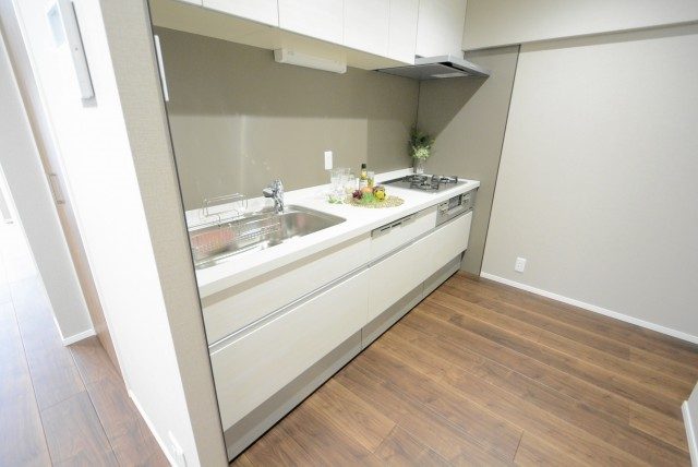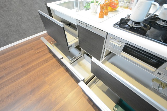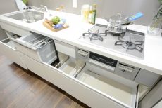 キッチンはリビングにいる家族と会話を楽しみながらお料理ができる対面式。配膳に便利なキッチンカウンターや浄水機能付き水栓、3口ガスコンロ、食洗機などがついておりスペック◎!