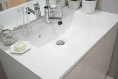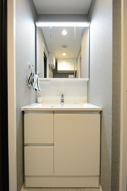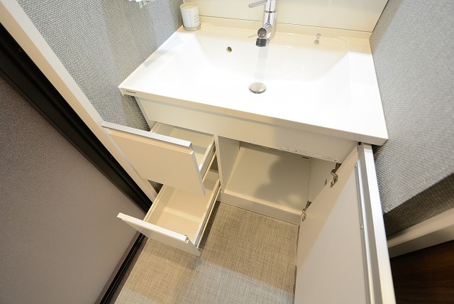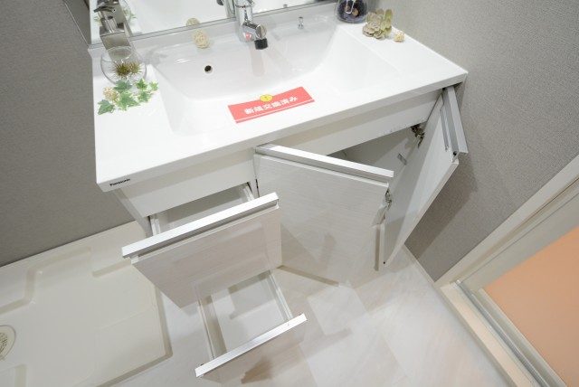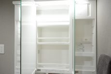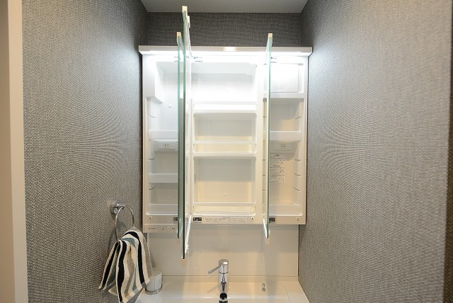 洗面化粧台は洗面ボウルの下の収納の他、鏡の裏も収納スペースがあります。ゴチャゴチャしがちな小物類もすっきりしまえますね。
