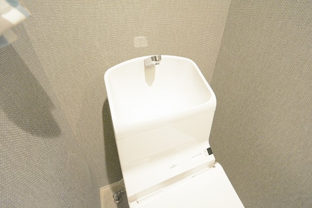トイレはLIXIL製の洗浄機能一体型。汚れが落ちやすく黒ずみや黄ばみを寄せ付けないアクアセラミックを使用し、日々のお掃除の手間を軽減してくれます。何と言っても「100年クリーン!」ですからね。コンパクトながら手洗いボウルも設置されています。