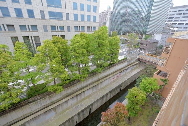 外は水路を挟んでマンションやビルが建ち並ぶ風景。