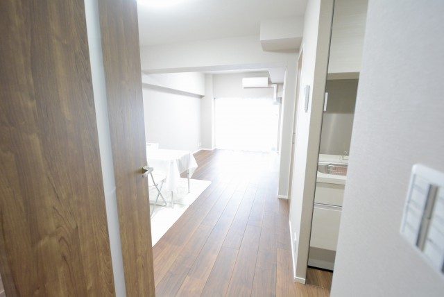 右側にサービスルーム、正面に洗面室、左側にLDKの扉があります。