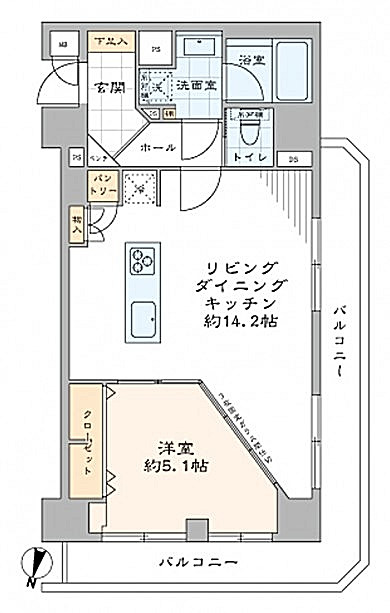 こちらは約14.2帖のリビング・ダイニング・キッチン。