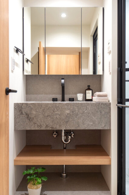 廊下に面した洗面室には、洗面化粧台の他に洗濯機スペースや浴室がまとまっていて脱衣所も兼ねています。洗面化粧台は重厚感のあるオリジナル。既成のプラスチック製システム洗面台とは高級感が違いますね♬大理石調のトップや黒の金物がナチュラルな木目によくマッチしています。