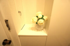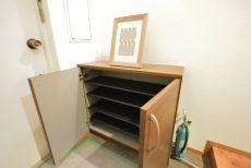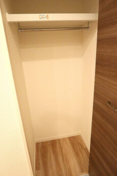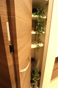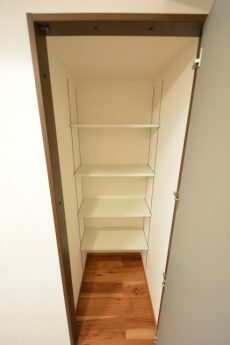 入口脇には収納棚がありました。奥行きがとても深く、棚の手前には背の高い物も入る様になっています。スティッククリーナーなんかも入れておけますね。